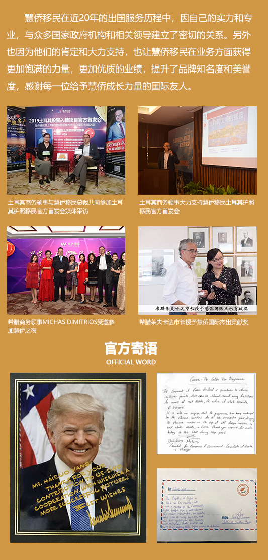 慧侨移民作为一家极具实力的团队,也赢得多国官方的鼎力支持,包括美国、英国、希腊、土耳其、马耳他、格林纳达、圣基茨、塞浦路斯等国。